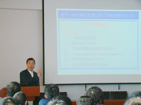 王安麟教授从一体化设计思想、健壮性设计评价、工程机械整机的数字化设计、大中型液压挖掘机液压元件一体化再设计系统的开发、挖掘机的数字化设计、其他装置的数字化研究等方面作了讲解,并就相关问题作了详细解答。