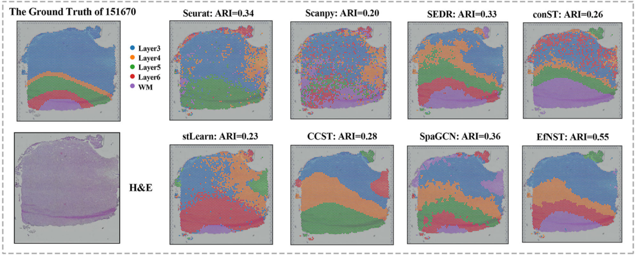 研究使用了来自三个测序平台(10x Visium、osmFISH 和 STARmap)的六个数据集来评估 EfNST 算法的聚类性能,相比于其他算法,EfNST算法能更精细地描绘人类乳腺癌,小鼠大脑,小鼠初级视觉皮层等组织的空间结构,并有效分析组织的标记基因的空间表达分布。随着不同提取技术的发展,算法有望扩展到更大更多的平台上处理空间转录组学中的空间域识别,探索未知区域,帮助解密不同区域中蕴含的生物学信息。