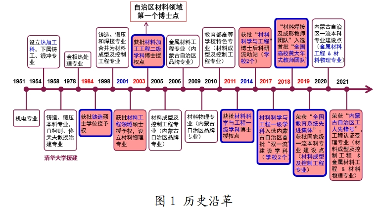 材料科学与工程学科是内蒙古自治区高校最早设立的材料类学科之一,源于1951年建校时开设的铸工和锻冲专业。1984年获批硕士学位授予权,2003年获批材料加工工程博士授权点;2011年获批材料科学与工程一级学科博士授权点。2014年获批“材料科学与工程”博士后科研流动站。2017年入选内蒙古自治区首批“双一流”建设学科,2023年入选第二批内蒙古自治区一流建设学科。在本科专业建设方面,材料成型及控制工程于2019年获批国家级一流本科专业建设点;金属材料工程、材料物理分别于2020年和2021年获批自治区级一流本科专业建设点。